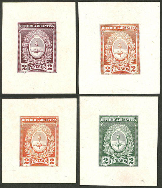 Centenary, 2c. National Coat of Arms, die essays of a design present by Compañía Sudamericana de Billetes de Banco and unadopted, 4 different colors, excellent lot!