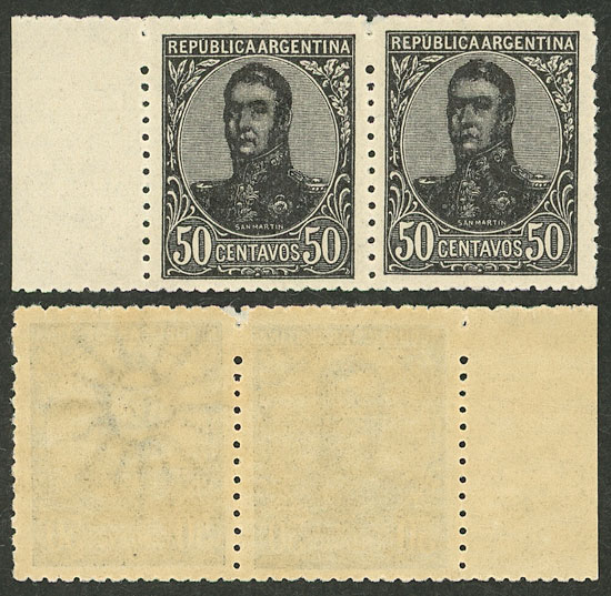 1909 50c. San Martín in oval, pair WITH AND WITHOUT WATERMARK, MNH (+50%), excellent! (Image)