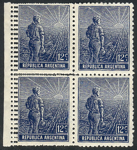 1923 5c. San Martín with period, fantastic block of 4 with notable unprinted areas in the 4 examples, excellent quality! (Image)