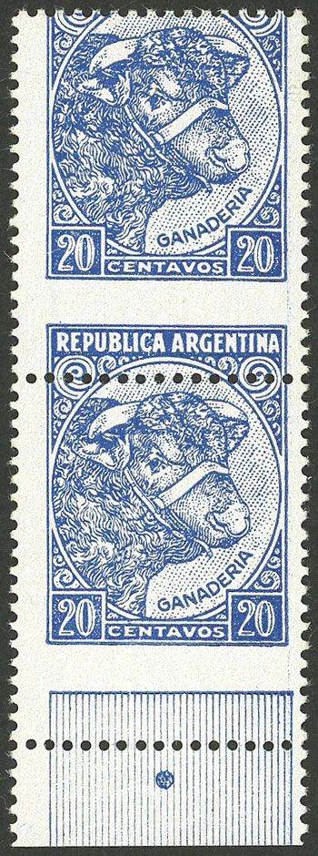 20c. Bull, chalky paper, pair with VERY SHIFTED PERFORATION (the bottom stamp WITHOUT "REPUBLICA ARGENTINA"), excellent quality! (Image)