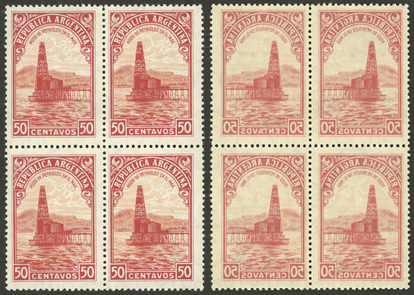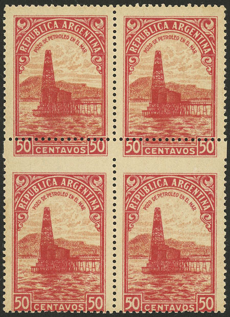 50c. Petroleum well at sea, block of 4 with the central perforation very shifted, the top stamps without face value, excellent! (Image)