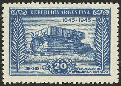 1945 20c. Mausoleum of Rivadavia with DOUBLE IMPRESSION variety, not catalogued, very fine quality, rare! (Image)