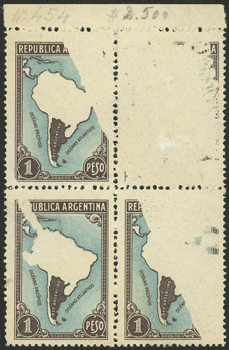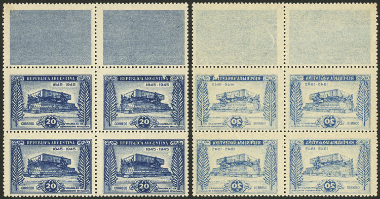 1945 20c. Mausoleum of Rivadavia, block of 4 with top labels, COMPLETE OFFSET IMPRESSION ON BACK, excellent! (Image)