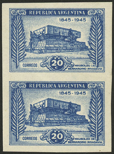 1945 20c. Mausoleum of Rivadavia, IMPERFORATE PAIR, mint without gum, very rare! (Image)