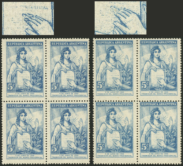 1946 Transmission of presidential power, 2 blocks of 4, each one with one stamp of position 55 (plate B) BEFORE AND AFTER the retouch in the fingers, very fine quality!