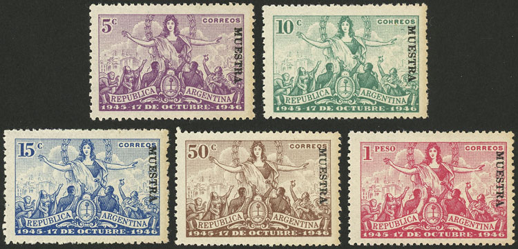 GJ.935/39, 1946 Anniversary of October 17 Movement (Peronism), the set of 5 values with MUESTRA overprint, very fine quality, rare! (Image)