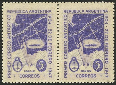 GJ.943SG, 1947 5c. First Antarctic mail, pair gummed on both sides and PRINTED ON GUM, VF quality! (Image)