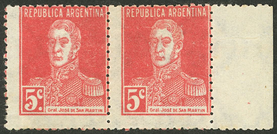 1927 5c. San Martín with AP watermark, pair WITH AND WITHOUT PERIOD after the value. The stamp with period also has an additional variety "period after the 5", excellent and rare! (Image)