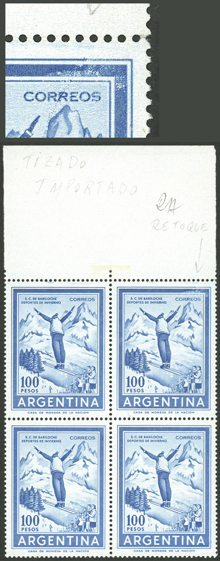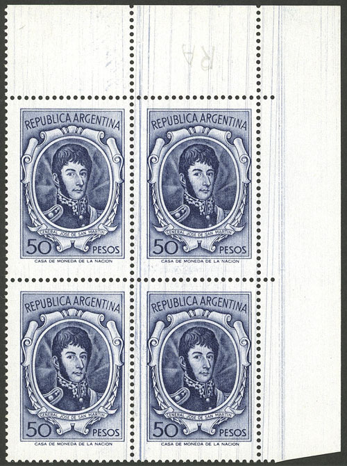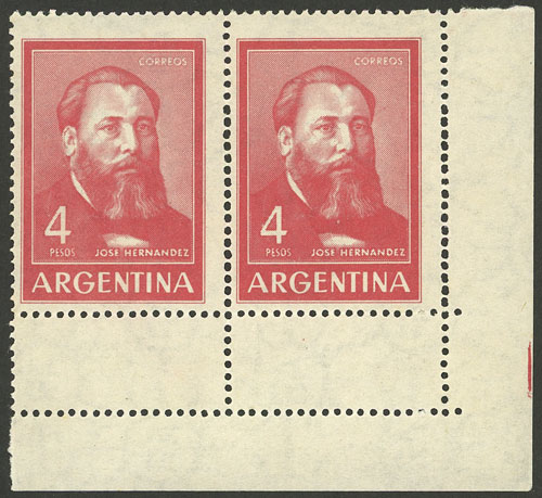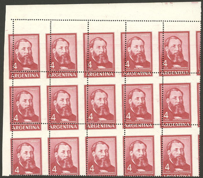 4P. José Hernández, corner block of 15 with notable variety VERY SHIFTED PERFORATION diagonally, the top stamps "without ARGENTINA", the rest with "ARGENTINA" at top, with natural crease of the impression, rare and fantastic! (Image)