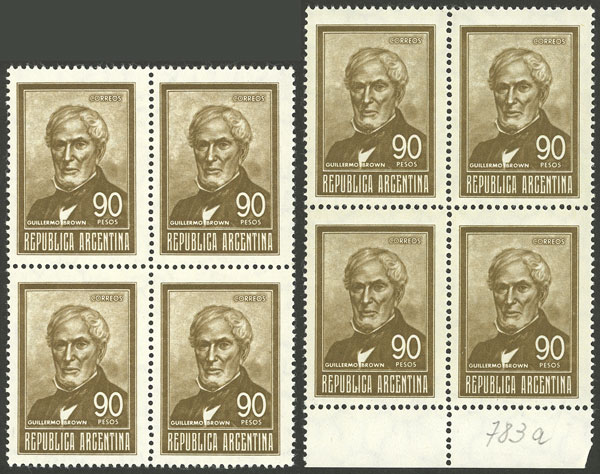 + 1320Aa, 90P. Brown, blocks of 4 printed on SOFT imported unsurfaced paper and HARD imported unsurfaced paper (rare), MNH, excellent quality! (Image)