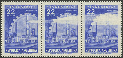 22P. Industry in photogravure, strip of 3 with large white spot due to lack of ink during the printing process, VF! (Image)