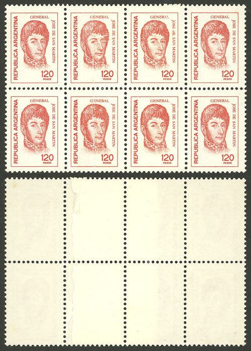 120P. San Martín, block of 8 with end-of-roll double paper variety, excellent! (Image)