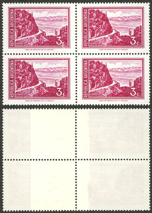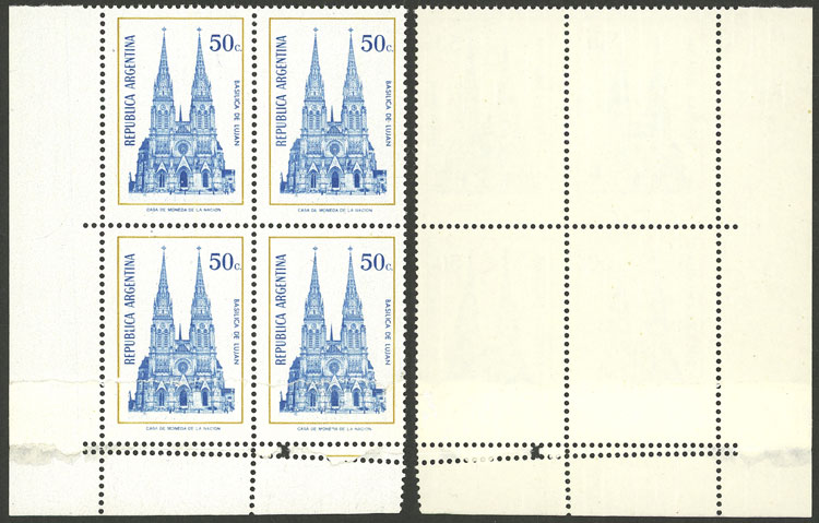 50c. Basilica of Luján, block of 4 with varieties: End-of-roll double paper and DOUBLE PERFORATION below, VF, rare! (Image)