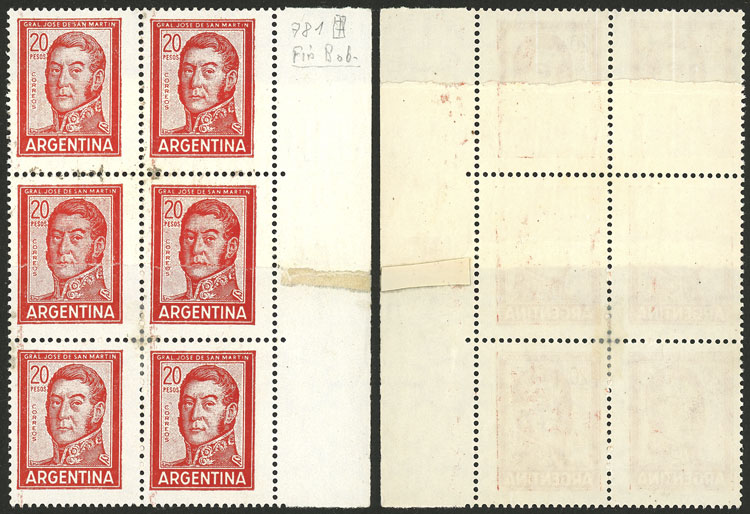 20P. San Martín typographed, block of 6 printed on END-OF-ROLL DOUBLE PAPER, very attractive! (Image)