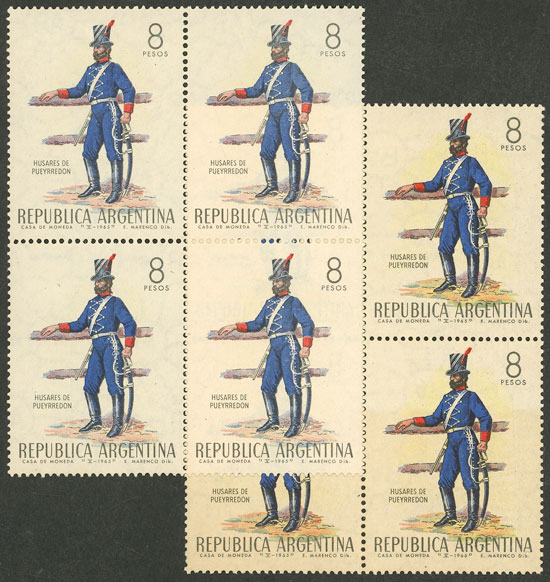GJ.1325a, 1965 Military uniforms, block of 4 with variety YELLOW OMITTED, along a normal block of 4 for comparison, VF quality! (Image)