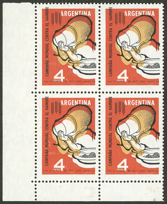 GJ.1250a, 1963 Fight Against Hunger, block of 4 with BLACK COLOR VERY SHIFTED, fantastic, VF! (Image)