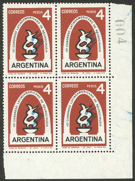 GJ.1265a, 1964 Congress of Neurosurgery, block of 4 with LIGHT BLUE COLOR VERY SHIFTED to the right, fantastic, catalog value US$80, low start! (Image)