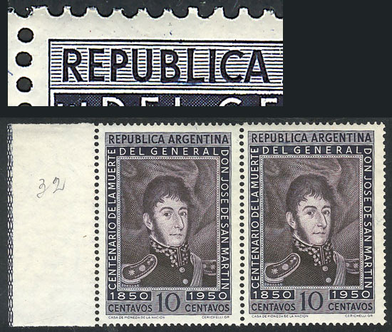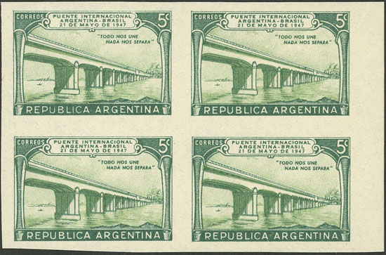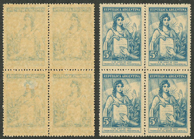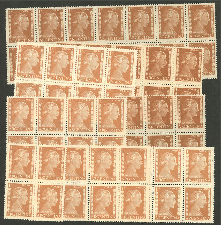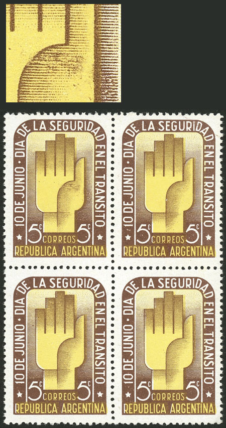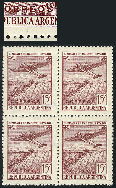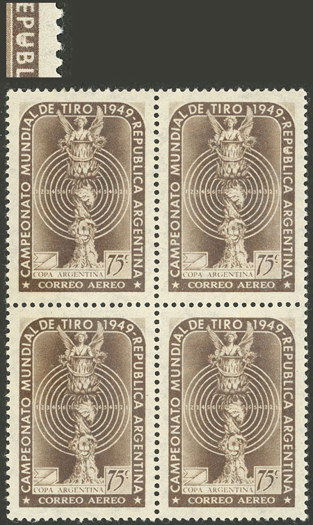 block of 4, one with VARIETY: "U" of REPÚBLICA with additional stroke resembling a lyre (pos.28) (Image)