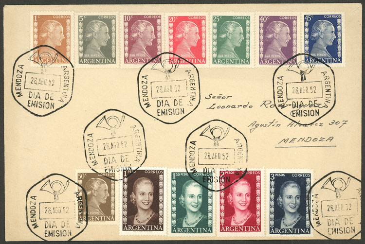 GJ.1003/14, Eva Perón, the first 12 values of the set on a cover with first day postmark (Image)