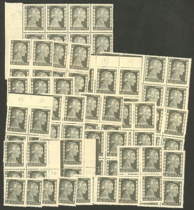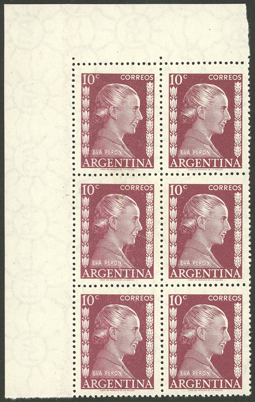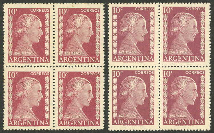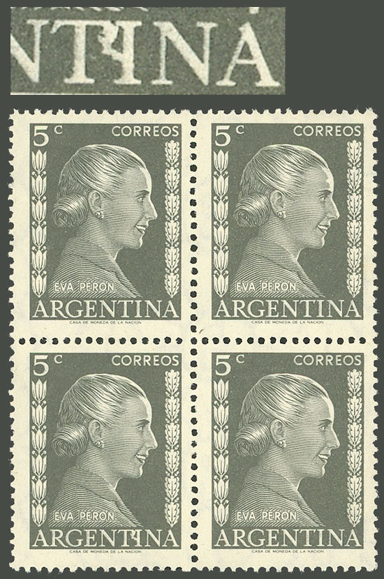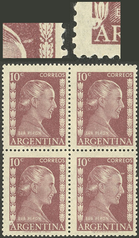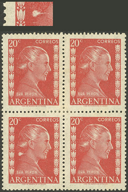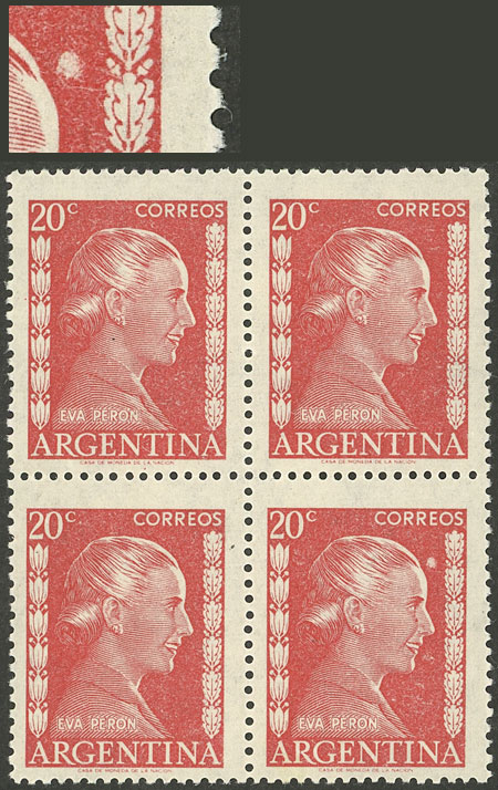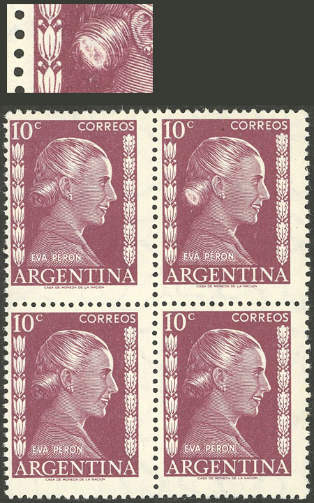 GJ.1005A, block of 4, the right stamps with VARIETIES: top one, dirty plate; bottom one, small dot on the second "A" of ARGENTINA (Image)