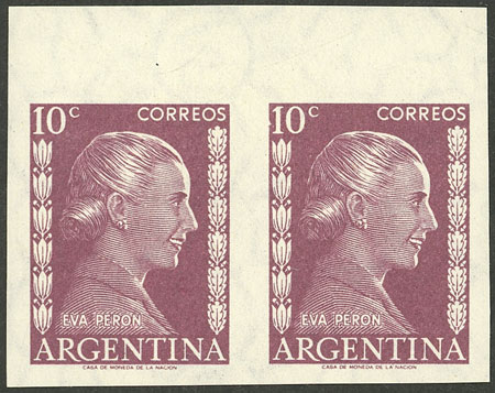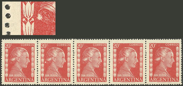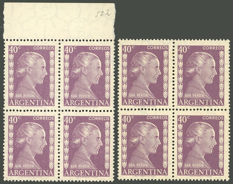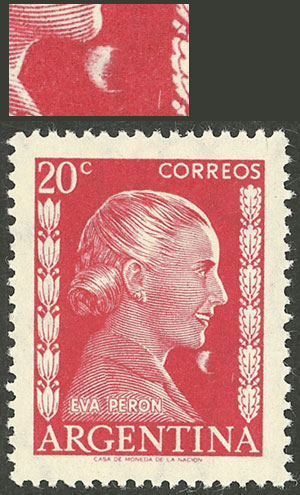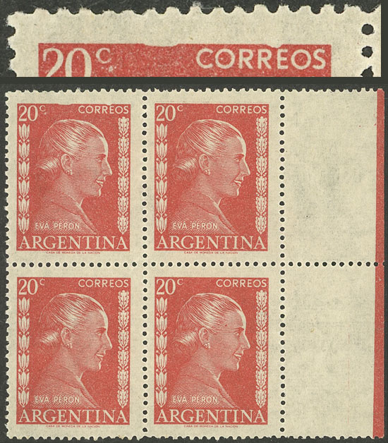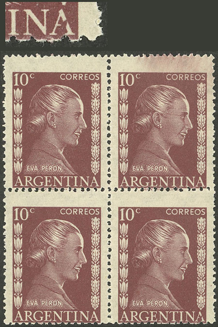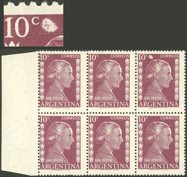 GJ.1005A, block of 4, the bottom stamps with VARIETIES: Left one, circle above the first "A" of ARGENTINA; right one, white line right of the forehead