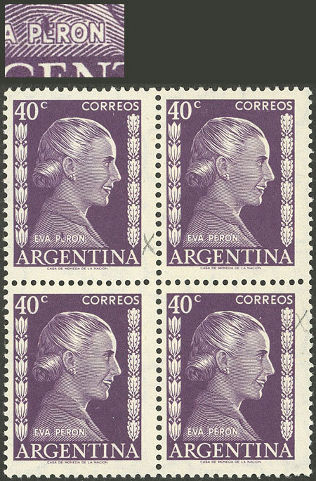 block of 4, one with VARIETY: color spot on the "E" of PERON (Image)
