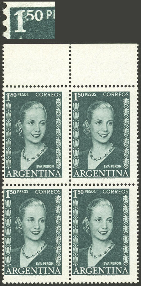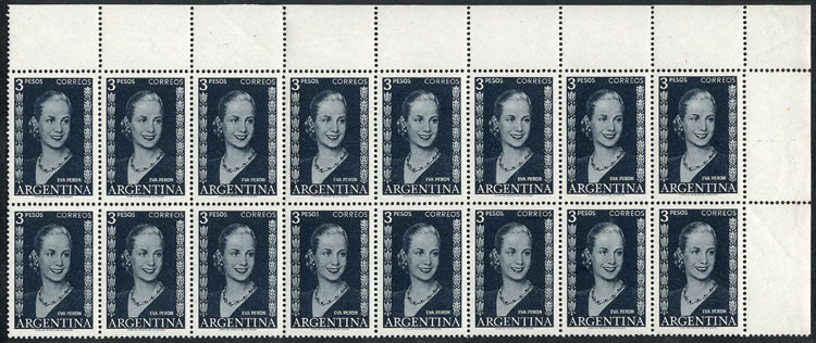 $3 Eva Perón with inscription, large corner block of 16 stamps, VF! (Image)