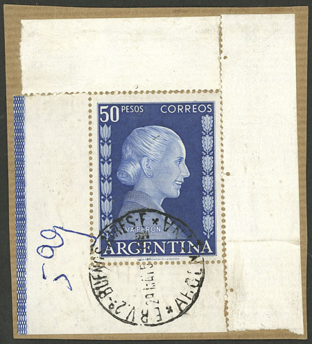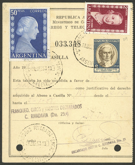+ another value, $50 Eva Perón (high value of the set), uprating a PO subscription card of $8 along with another stamp of $2, used in Comodoro Rivadavia on 28/DE/1953, the stamp of excellent quality (Image)