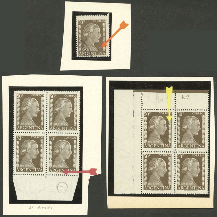 GJ.1010b, 2 blocks of 4 + single with different identified VARIETIES: "ARGFNTINA" + white spot in front of the neck + flower (Image)