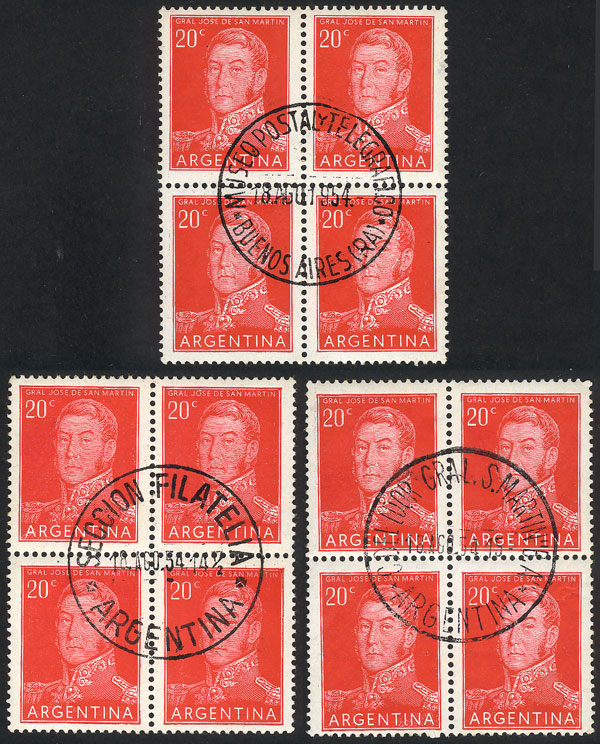 20c. San Martín, typographed, 3 blocks of 4 with DIFFERENT first day postmarks, rare group! (Image)