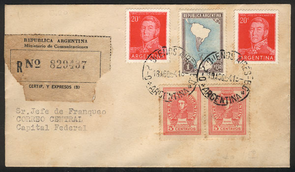 postage combining stamps of Proceres & Riquezas I and II, total postage $1.50 (GJ.1034 x2 + other values), used on 18/AU/1954 (fist day of issue), one stamp with "UOSE" variety, extremely rare!! (Image)