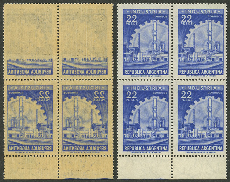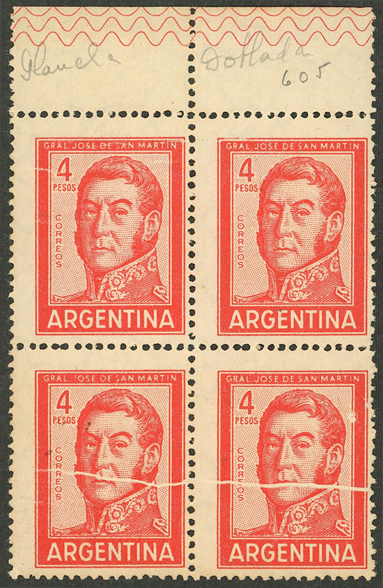 marginal block of 4, VARIETY: Offset impression on back (2 stamps complete and 2 partial) (Image)
