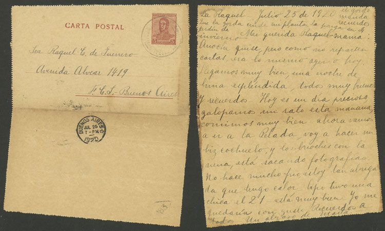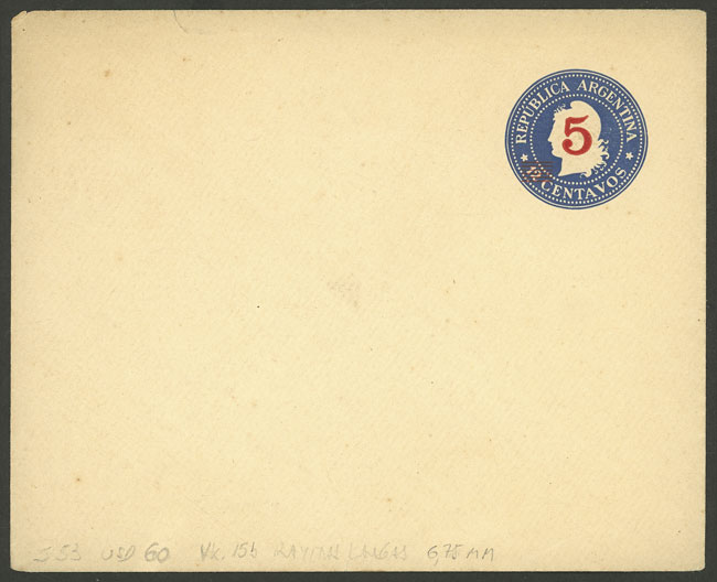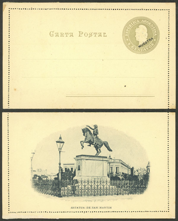 4c. postal card, with MUESTRA overprint, view on back of statue of San Martín, the borders are glued together, very nice! (Image)