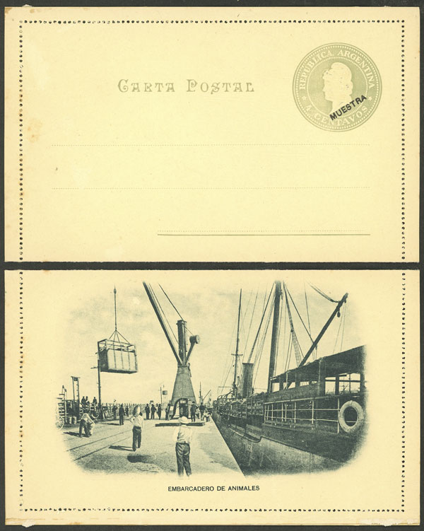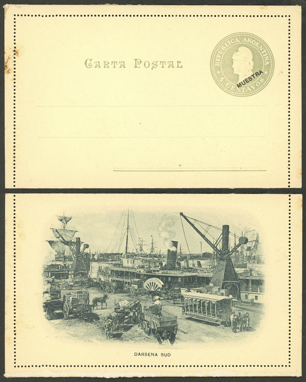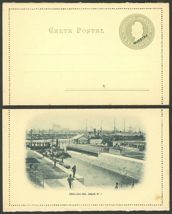 4c. postal card, with MUESTRA overprint, view on back of Dársena Sud dock, the borders are glued together, very nice! (Image)
