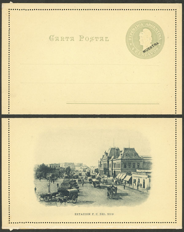 4c. postal card, with MUESTRA overprint, view on back of F.C. del Sud train station, the borders are glued together, very nice! (Image)