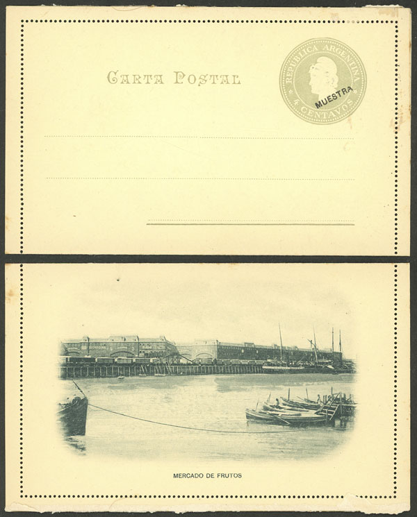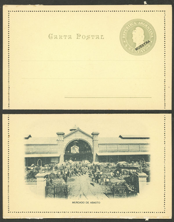 4c. postal card, with MUESTRA overprint, view on back of Abasto market place, the borders are glued together, very nice! (Image)