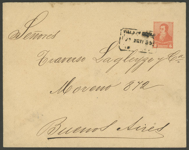 Stationery envelope cancelled "VILLA MERLO" (San Luis), sent to Buenos Aires in NO/1895, VF (Image)