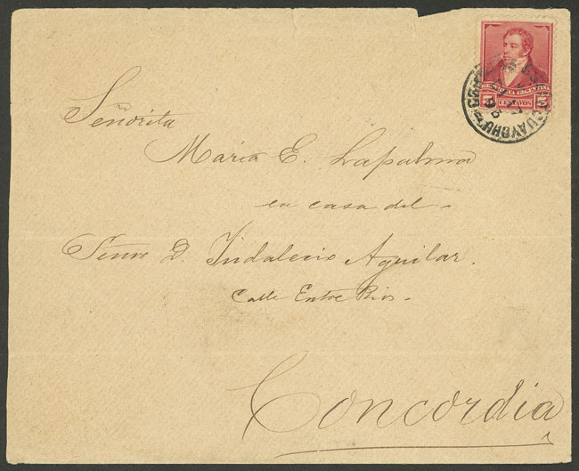 sent from Gualeguaychú to Concordia on 17/DE/1893, franked with 5c. (GJ.141), and arrival backstamp (Image)