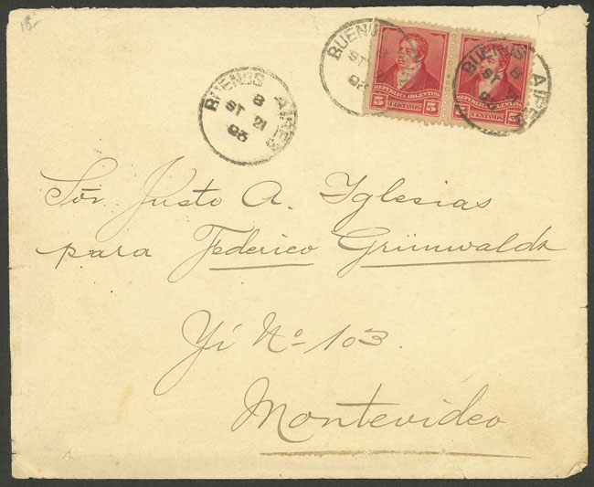 sent from Buenos Aires to Montevideo on 21/SE/1893, franked with 10c. (GJ.141 in pair), arrival backstamp (Image)