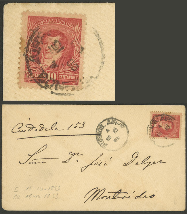 15/OC/1893, Buenos Aires - Montevideo, cover franked with 10c. (GJ.168, compound perf 11½ x 12¼), rare! (Image)