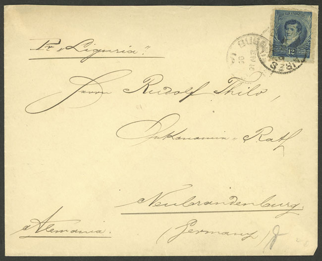 sent from Buenos Aires to Germany by steamship "LIGURIA" on 16/JA/1896, franked with 12c. (GJ.180), arrival backstamp (Image)