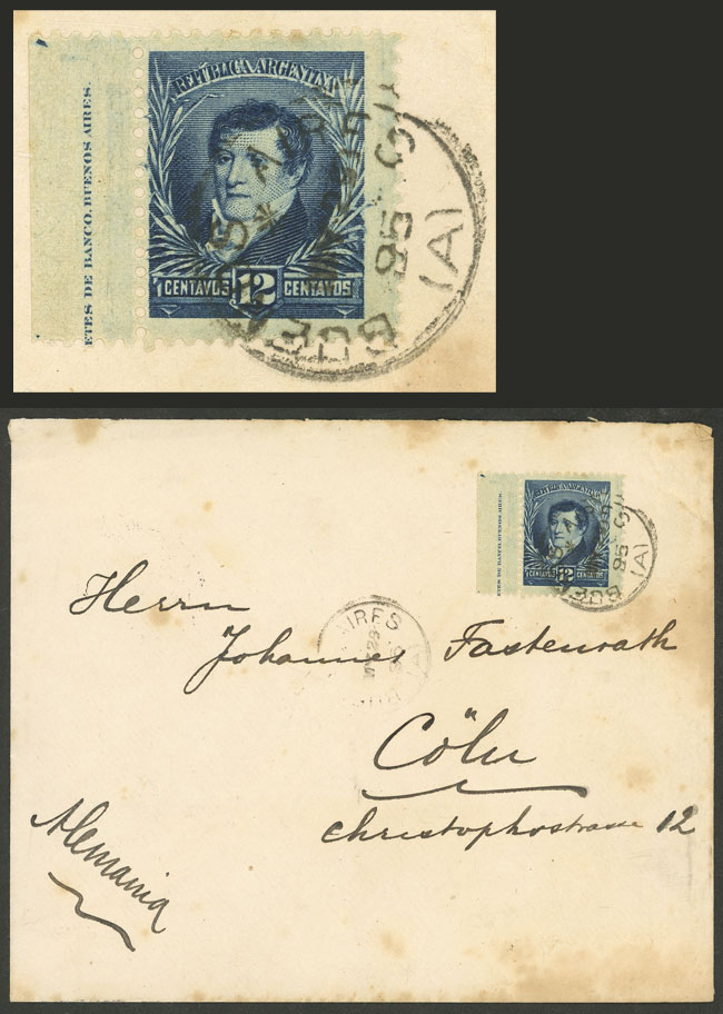 sent from Buenos Aires to Germany on 29/MAY/1895, franked with 12c. (GJ.158, perf 12¼, with sheet margin and printer imprint), arrival backstamp (Image)