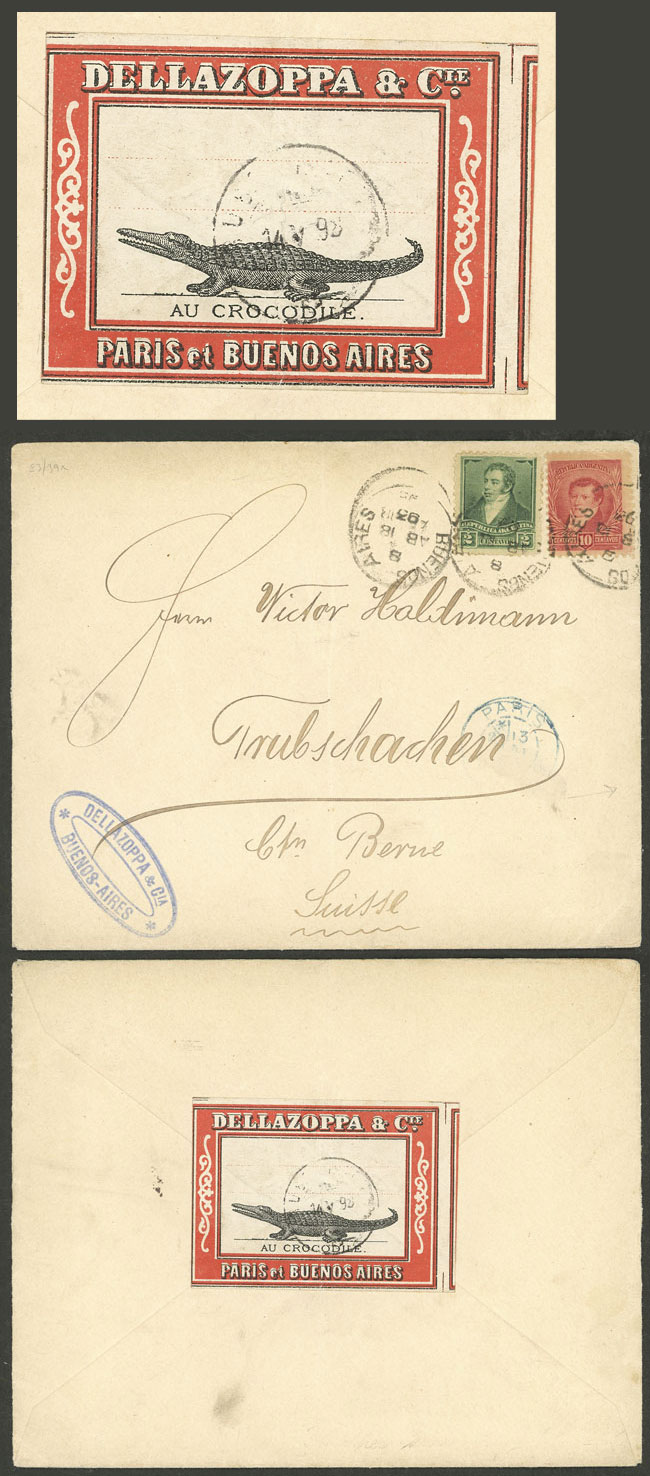 sent from Buenos Aires to Switzerland on 18/AP/1893, franked with 12c. (GJ.139 + 143), with advertising cinderella of "DELLAZOPA & Cie" (crocodrile) on back as a seal, and arrival mark (Image)