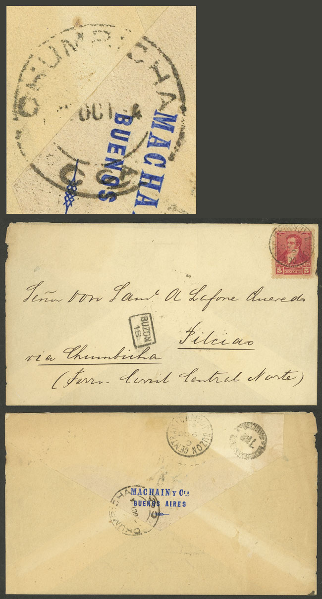 9/OC/1894 Buenos Aires - Pilciao (Catamarca), cover with postmark of Buzón Central + rectangular "BUZÓN 18" on front, sent by Ferrocarril Central Norte via Chumbicha (mark of this town on back), franked with 5c. (GJ.141) (Image)
