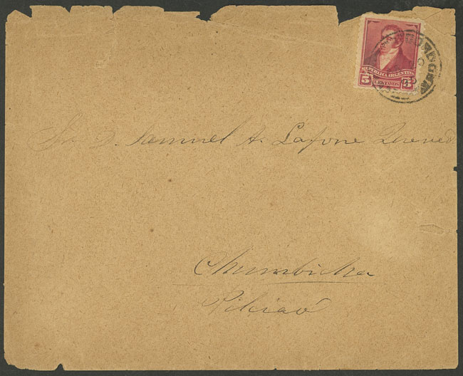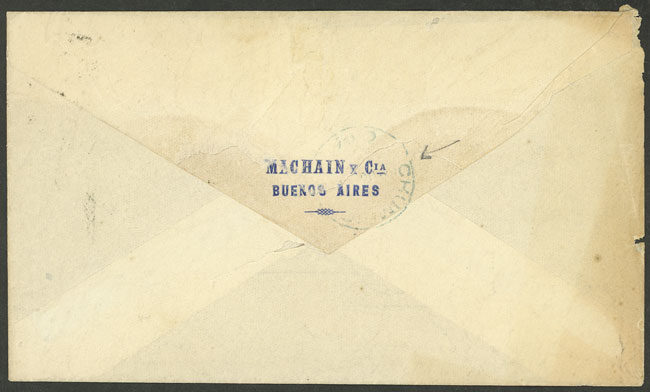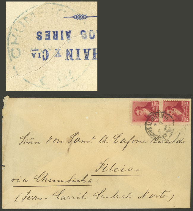 Cover sent from Buenos Aires to Pilciao (Catamarca) via Chumbicha (mark of this town on back) in 1894, franked with 10c. (GJ.141 in pair) (Image) (Image-02)