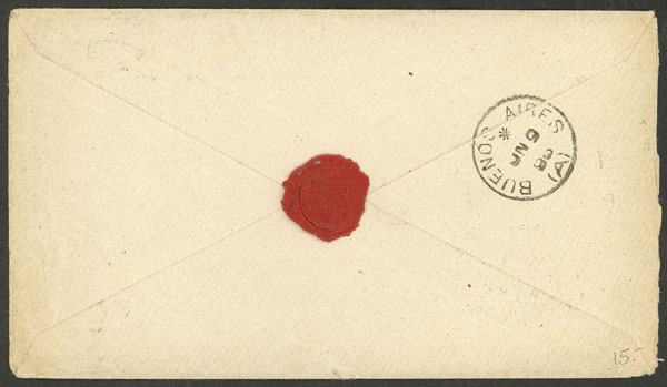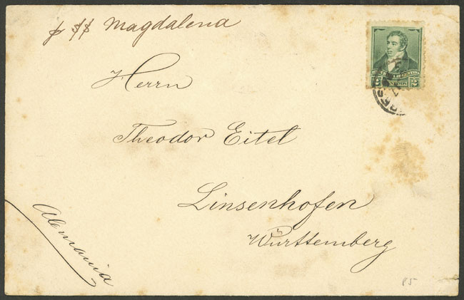 sent from Buenos Aires to Germany by steamship "MAGDALENA" in 1895, franked with 2c. (GJ.139), arrival backstamp, light staining (Image)