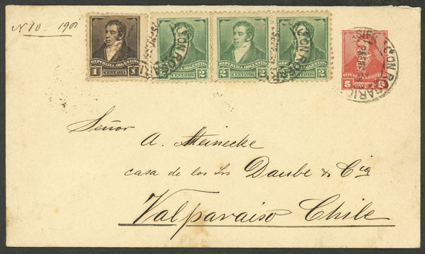 Stationery envelope (SOB-30) sent from Rosario to Chile on 25/JA/1896, uprated with 7c. (GJ.175 + 3x 176), arrival backstamp (Image)