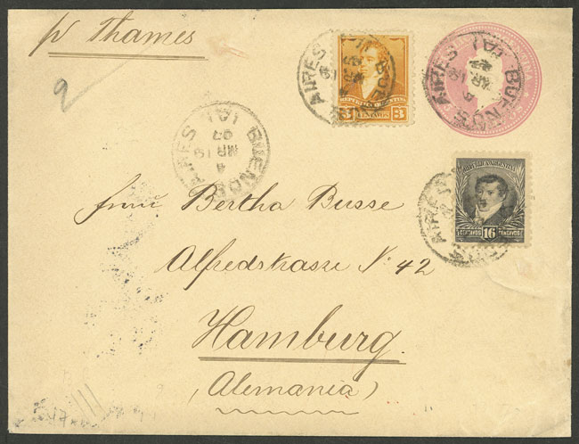 Stationery envelope (SOB-37) sent by steamship "THAMES" from Buenos Aires to Germany on 19/MAR/1897, uprated with 19c. (GJ.177 + 181), arrival backstamp (Image)