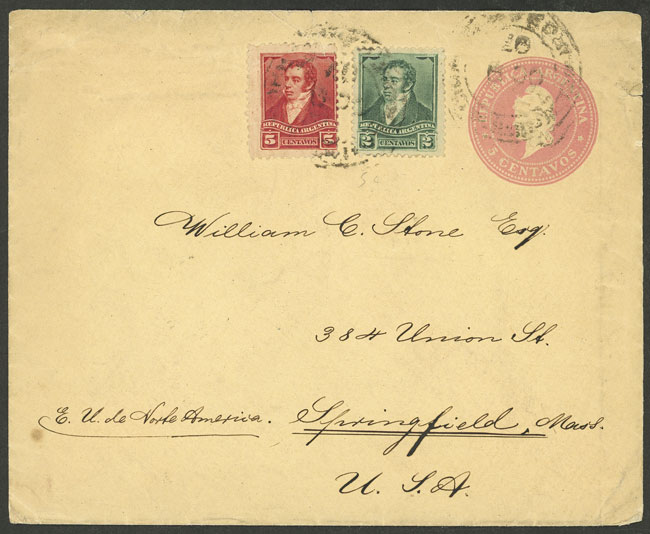 Stationery envelope (SOB-37) sent from Buenos Aires to USA on 9/OC/1897, uprated with 7c. (GJ.178 + 192 perf 12¼), arrival backstamp (Image)