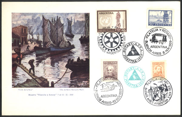 card of the "Philately and Rotary" exhibition of November 1959, with different handstamps, very nice (Image)